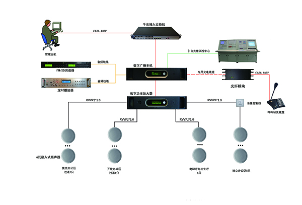 近年來,辦公大樓、購物中心和其他大規(guī)模建筑工程對于公共廣播系統(tǒng)能夠具備呼叫分配、播音、背景音樂及對建筑物內(nèi)的特定區(qū)域進(jìn)行常規(guī)信息播放的功能之要求日益增加??坪^k公樓廣播系統(tǒng)的設(shè)計,順應(yīng)潮流和科技發(fā)展趨勢,從投資合理、外觀美觀、設(shè)計規(guī)范的設(shè)計原則出發(fā),要求廣播系統(tǒng)具備如下功能:①兼顧背景音樂、公共廣播、消防廣播的功能;②全數(shù)字結(jié)構(gòu);③結(jié)合防火分區(qū)劃分廣播分區(qū);④各廣播分區(qū)獨(dú)立音源、獨(dú)立廣播;⑤緊急廣播具備優(yōu)先控制權(quán)。