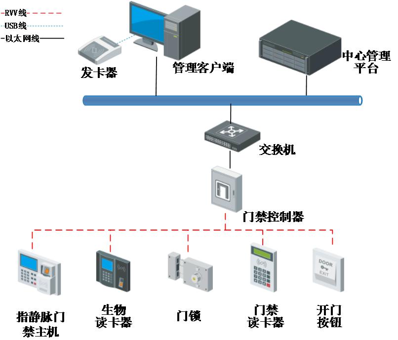 門禁讀卡器、生物識(shí)別讀卡器、開門按鈕、磁力鎖等前端門禁設(shè)備通過(guò)RVV4*0.75/ RVV2*0.75線纜接入到網(wǎng)絡(luò)門禁控制器上,而網(wǎng)絡(luò)門禁控制器通過(guò)非屏蔽雙絞線接入交換機(jī)經(jīng)局域網(wǎng)集成到安防綜合管理平臺(tái)上。